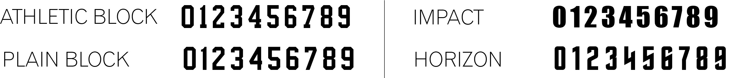 Sublimated Numbers and Name Bars can be ordered in a variety of fonts, colors, and sizes.